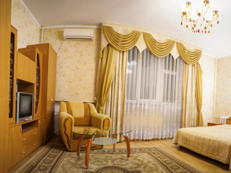 Номер 1-комнатный ЛЮКС+. В номере: большая комфортная кровать с тумбочками, столик, шкаф, комод, мини-кухонная мебель, комфортный сан.узел с душевой кабиной, полотенца. Плазменный телевизор, холодильник, кондиционер, чайник.